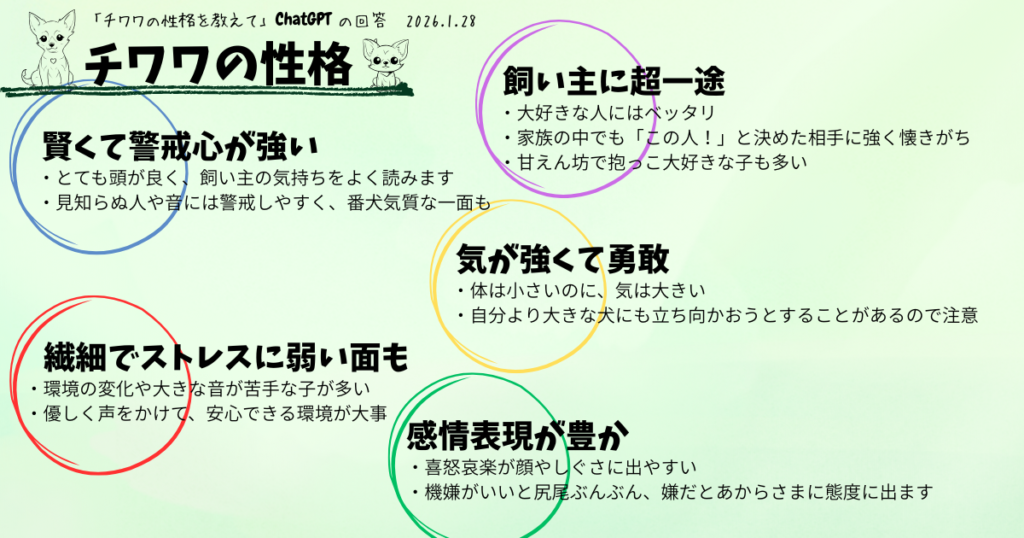 また、ChatGPTにチワワの性格を聞いてみたところ、一言で言うと 「小さいけど存在感は特大」ということでした。